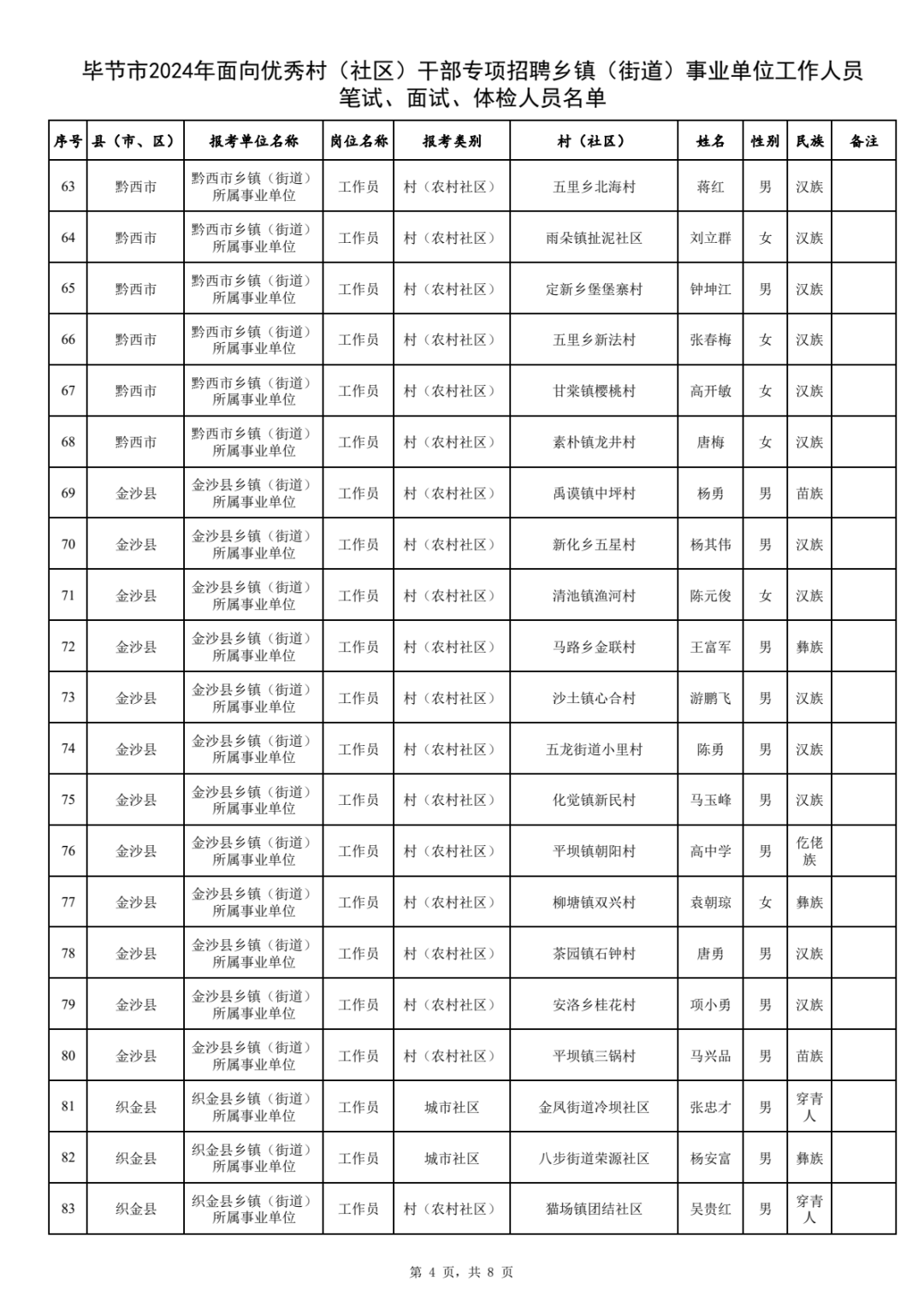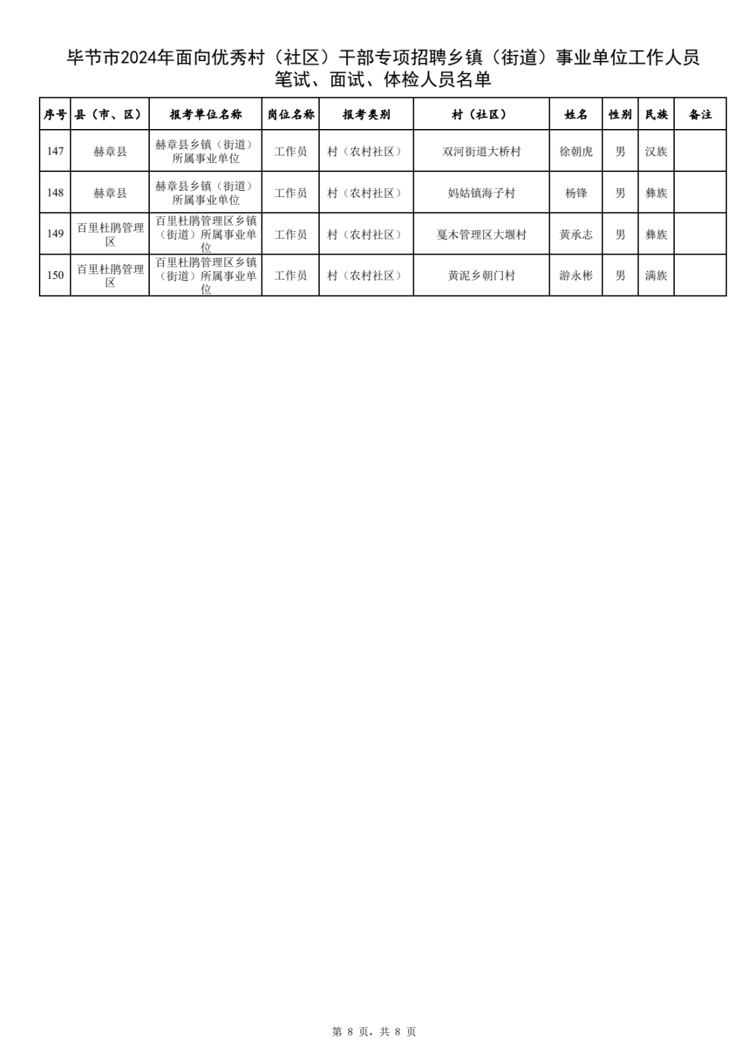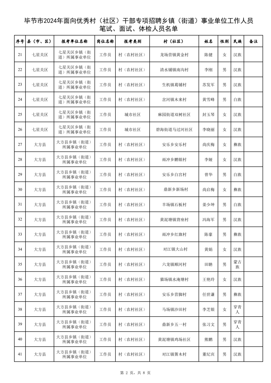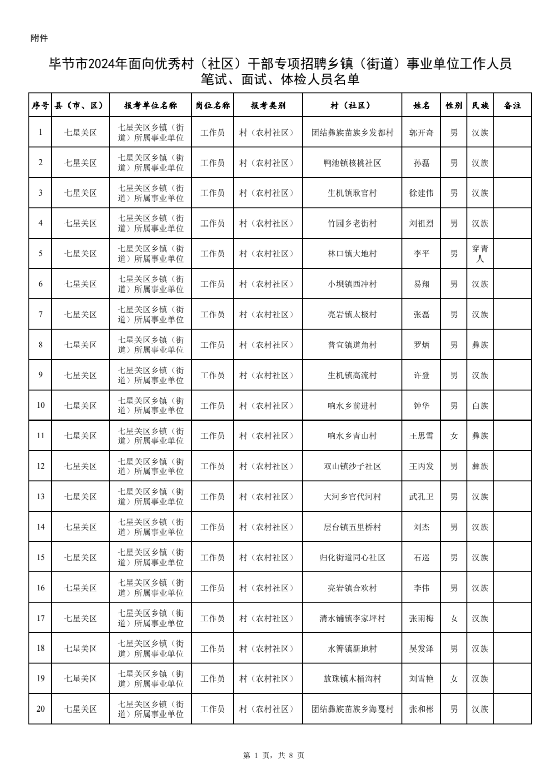 附件:毕节市2024年面向优秀村(社区)干部专项招聘乡镇(街道)事业单位工作人员笔试、面试、体检人员名单